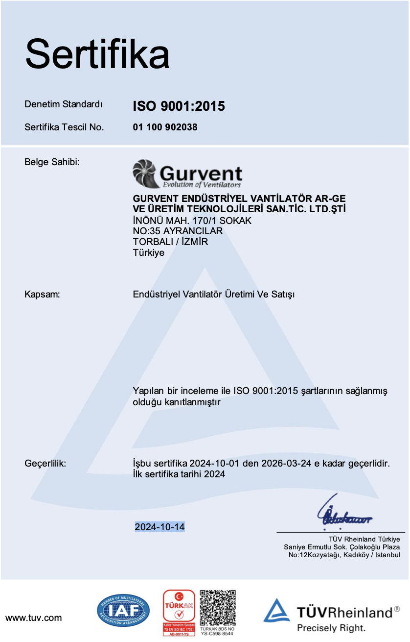 Firmamız, TÜV Rheinland onaylı ISO 9001:2015 Kalite Yönetim Sistemi ve ISO/IEC 80079-34 standardına uygun olarak, ATEX ekipmanların tasarım, üretim ve kontrol süreçlerini yürütmektedir. ATEX kapsamındaki fanlarımızda yalnızca tasarım ve malzeme uygunluğu değil, üretim sürecinin tamamı kalite güvencesi altındadır. Fabrikamızdan çıkan her bir fan, aşağıdaki bilgileri içeren ürüne özel sertifika ile sevk edilmektedir: